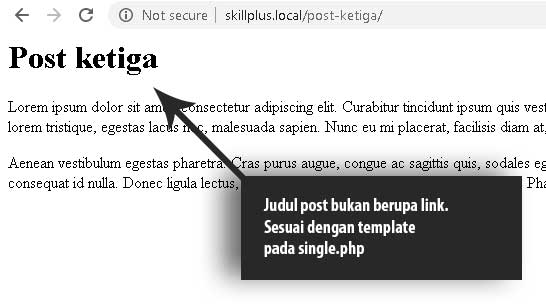 Seperti sudah dibahas pada modul sebelumnya, saat kita click judul post, kita membuka single post dengan file index.php. WordPress akan mencari file single.php, karena tidak ada maka akan digunakan file index.php sebagai fallback.
