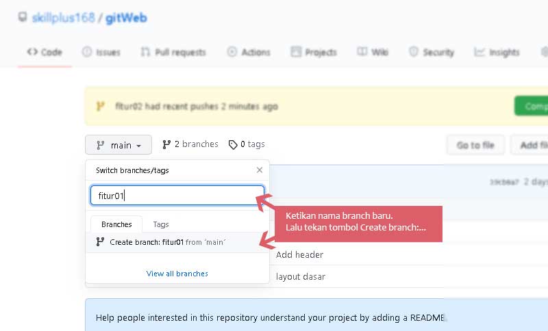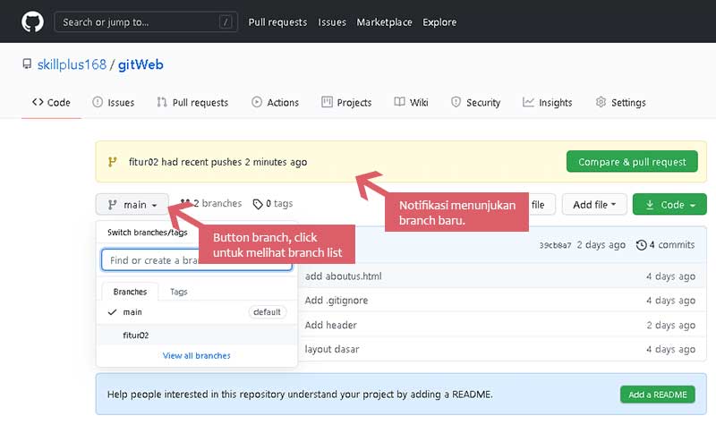 Jika Anda buka github, maka akan ada notifikasi branch baru telah ditambahkan. Anda juga bisa lihat list branch dengan menekan button branch (lihat gambar berikut).