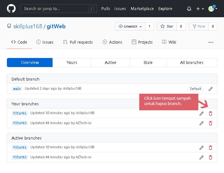 Setelah list branch tampil, delete branch yang dimaksud dengan menekan tombol dengan icon tempat sampah. Lihat gambar berikut.
