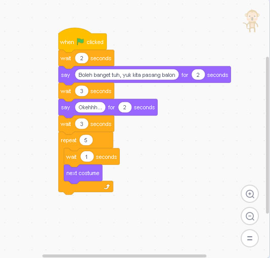 Kembali ke sprite monkey, tambahkan block wait __ seconds, sesuaikan waktu tunggu agar pas. Lalu tambahkan block say __ for __ seconds dimana monkey akan menyetujui untuk membesarkan balon.