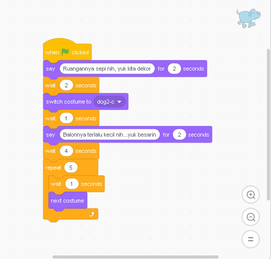 Kembali ke sprite dog, tambahkan block wait __ seconds, sesuaikan waktu tunggu agar pas setelah monkey selesai bicara. kemudian ganti costume seolah dog sedang berpikir dengan block switch costume to dog2-c, lalu berbicara balon terlalu kecil dan mengajak monkey untuk membesarkan balon, say __ for __ seconds.