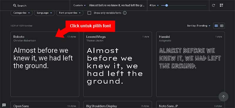 Buka web https://fonts.google.com/ lalu pilih font yang akan digunakan, misalnya Roboto, click Panel Roboto.