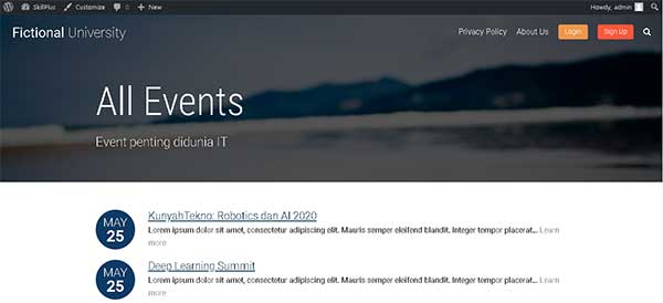 Pada modul ini kita akan mengubah file front-page.php untuk menampilkan Event custom post type yang dibuat pada modul sebelumnya.