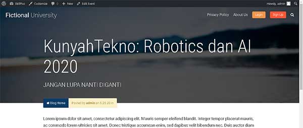 Jika Anda buka kembali post event, maka event akan ditampilkan dengan baik. Namun saat ini WordPress masih menggunakan file template single.php. Dapat dilihat pada bagian breadcrumb, tertulis Blog Home. Dan pada bagian category tidak tampil.