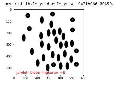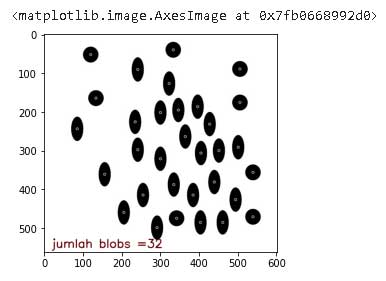 #deteksi blob menggunakan parameter params = cv2.SimpleBlobDetector_Params() params.filterByArea = True params.minArea = 100 params.filterByCircularity = True params.minCircularity = 0.9 #params.filterByConvexity = False #params.minConvexity = 0.2 params.filterByInertia = True params.minInertiaRatio = 0.01 detector = cv2.SimpleBlobDetector_create(params) keypoints = detector.detect(img) blank = np.zeros((1,1)) blobs = cv2.drawKeypoints(img, keypoints, blank, (255,255,255), cv2.DRAW_MATCHES_FLAGS_DEFAULT) blobs_count = len(keypoints) txt = 'jumlah blobs lingkaran =' + str(blobs_count) cv2.putText(blobs, txt, (20, 550), cv2.FONT_HERSHEY_SIMPLEX, 1, (255, 0, 0), 2) plt.imshow(blobs)