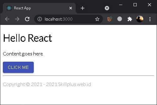 Jika kita jalankan, maka Aplikasi react sudah menampilkan button yang disediakan oleh Material-UI.