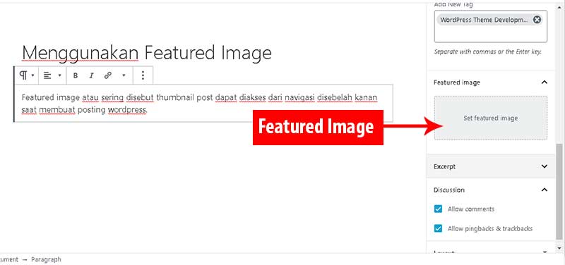Featured image atau sering disebut thumbnail post dapat diakses dari navigasi disebelah kanan saat membuat posting wordpress.
