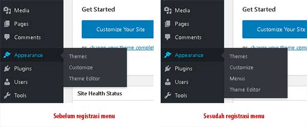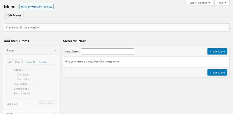 Jika Anda lihat pada WordPress Dashboard, menu untuk mengatur WordPress Menus tidak ada. Ini terjadi karena penggunaan menu belum dilakukan.