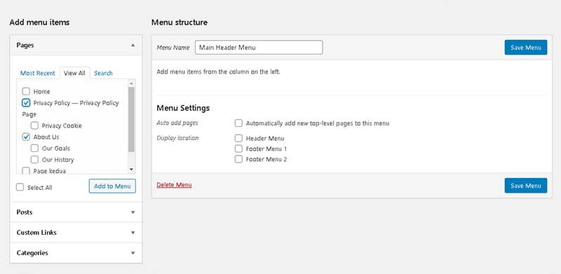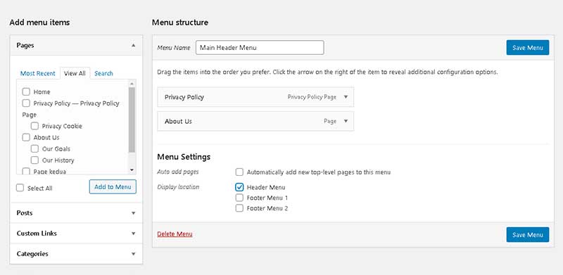 Lalu pilih page yang akan ditampilkan pada menu (lihat navigasi bagian kiri, pilih tab View All). Pada contoh kita pilih Privacy Policy dan About Us. Lalu click Add to Menu.