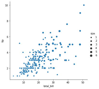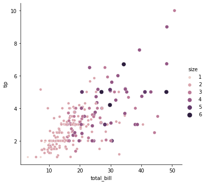 sns.relplot(x="total_bill" y="tip", data="tips", kind="scatter", size="size", hue="size") plt.show()