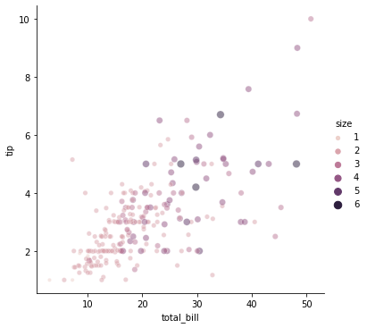 sns.relplot(x="total_bill", y="tip", data=tips, kind="scatter", size="size", hue="size", alpha=0.5) plt.show()