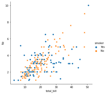sns.relplot(x="total_bill", y="tip", data=tips, kind="scatter", style="smoker", hue="smoker") plt.show()