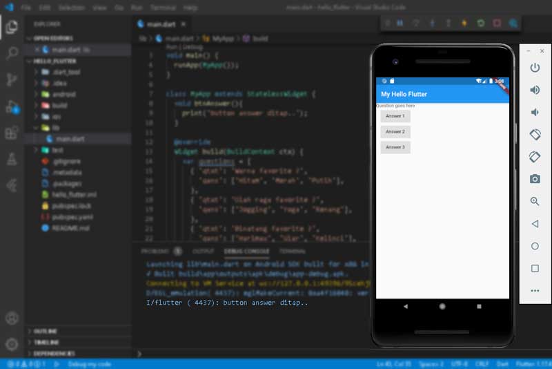 Fungsi btnAnswer() adalah fungsi yang dipanggil saat RaisedButton ditekan. Untuk saat ini hanya menampilkan text ke console (lihat gambar diatas pada console tampil: I/flutter ( 4437): button answer ditap..)