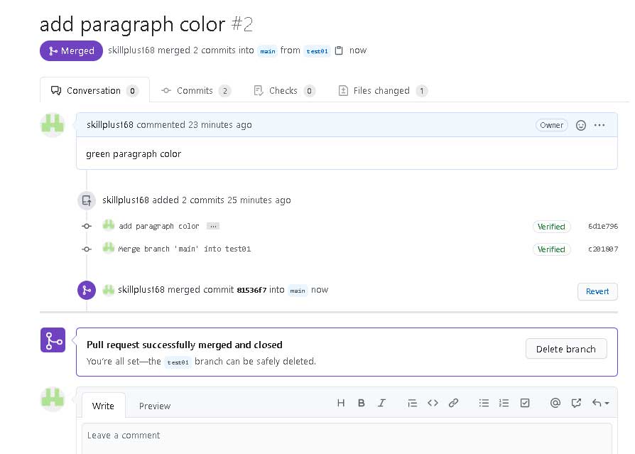 Proses merge konflik pada GitHub sudah selesai. Anda juga bisa menghapus branch test01 dengan menekan tombol delete branch.