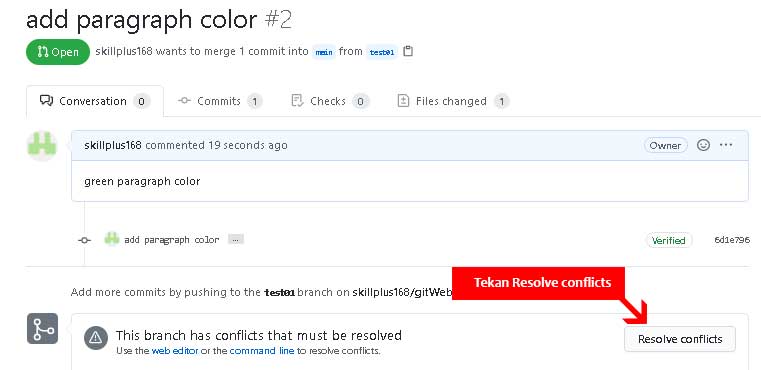 Proses merge conflict pada GitHub sama seperti pada merge fast-forward, perbedaannya adalah pada screen merge, kita harus melakukan proses resolve.
