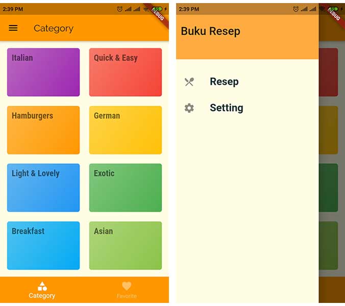 Pada resep_tab_scr.dart, pada widget Scaffold kita tambahkan property drawer: yang memanggil file main_drawer.dart.