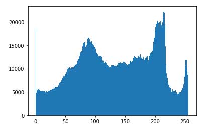 import cv2 import numpy as np import matplotlib.pyplot as plt img = cv2.imread('chureito-pagoda.jpg') hist = cv2.calcHist([img], [0], None, [256], [0, 256]) %matplotlib inline plt.hist(img.ravel(), 256, [0, 256]) plt.show()