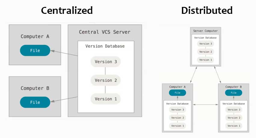 Distributed sistem menyimpan project version dilokal dan server. Lebih aman jika server corrupt, kita masih memiliki file backup. Selain itu kita bisa melakukan versioning tanpa network connection.