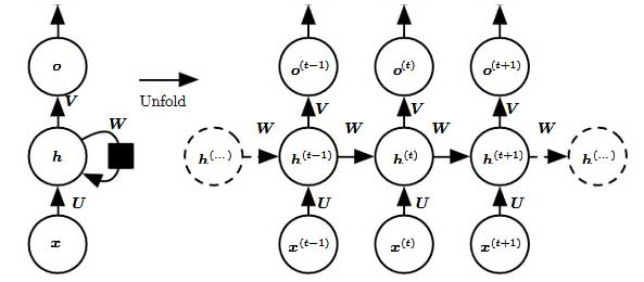 Weights: weight matrix U untuk koneksi dari RNN ke hidden layer, weight matrix W digunakan untuk koneksi dari hidden-to-hidden, dan koneksi hidden-to-output menggunakan weight matrix V.