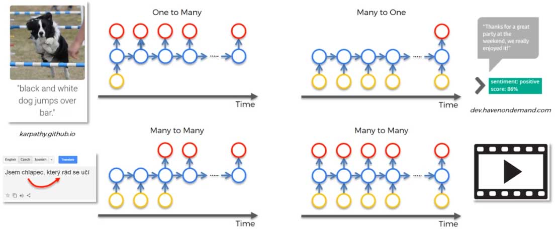 Hal yang menarik pada RNN adalah mampu menerima lebih dari satu input dan menghasilkan lebih dari satu output. Berikut contohnya: