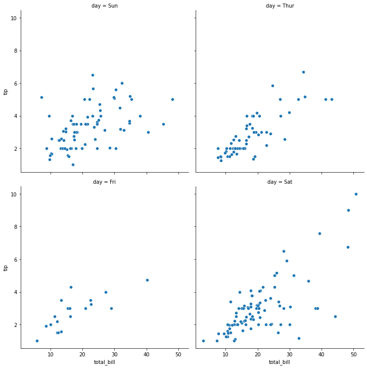 sns.relplot(x="total_bill", y="tip", data=tips, kind="scatter", col="day", col_wrap=2, col_order=["Sun", "Thur", "Fri", "Sat"]) plt.show()