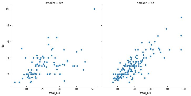 sns.relplot(x="total_bill", y="tip", data=tips, kind="scatter", col="smoker", row="time") plt.show()