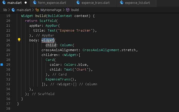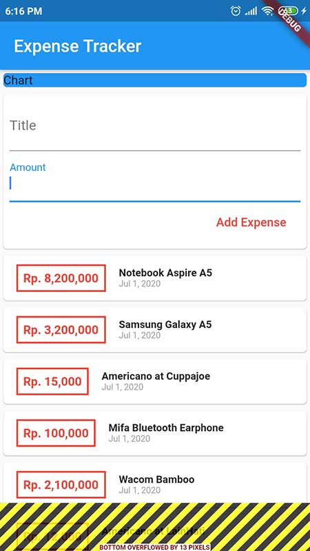 Kita akan membahas widget ListView pada file expense_list.dart. ListView adalah widget untuk menampung widget dengan salah satu kelebihannya adalah scrollable, dapat mencegah issue error tampilan overflowed.