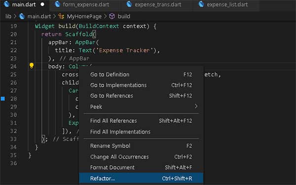 Langkah Pertama, tempatkan cursor pada widget yang akan kita wrap. Misalnya column, click kanan, pilih menu refactor. Akan tampil lagi popup menu, pilih Wrap with widget.