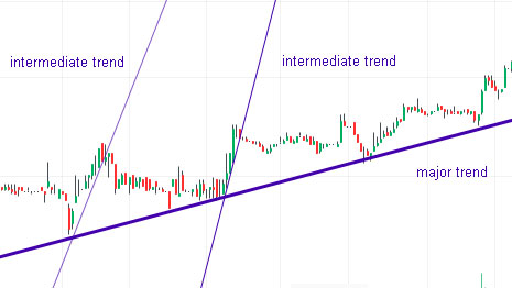 Atau kita bisa menempatkan beberapa garis trend berdasarkan time horizon untuk menunjukan major trend dan intermediate trend.